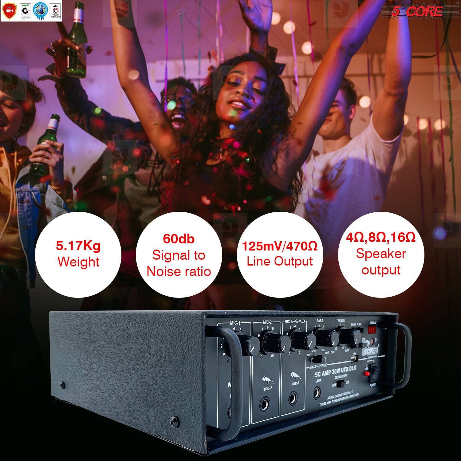 - 🗸 2-Way Power Source PA Amplifier (AC Mains and 12V DC). Easily compatible with mixers. Lightweight easy installation and low power consumption. 3 Microphone inputs & 1 AUX Input with MIC3/AUX selector switch. Multiple sound modes Dodging, Pitch bend, Pop, shout, Voice-over, Electro.